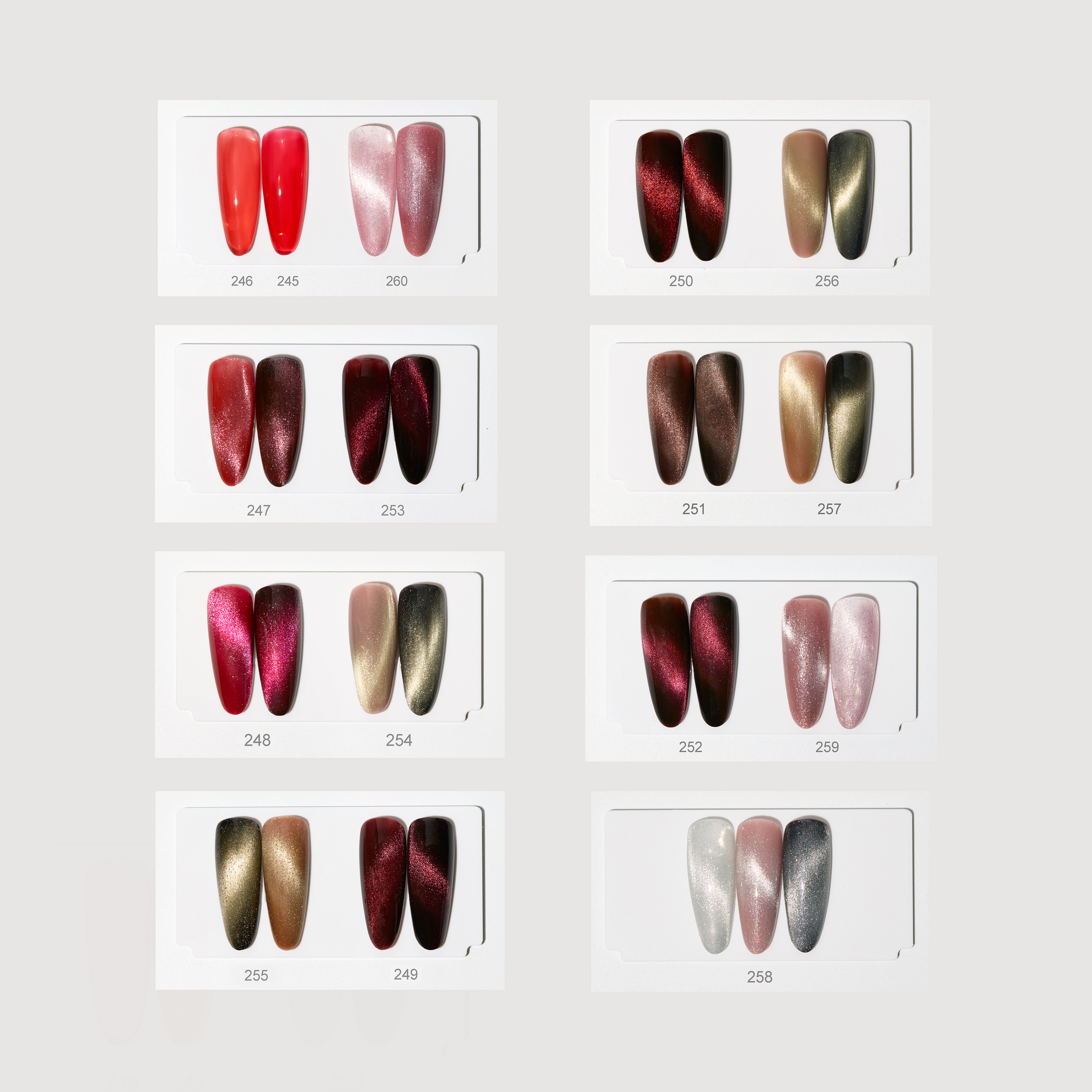 Wat zit er in de collectie?✔️ 14 unieke Cat-Eye Gelpolish kleuren (kleur nr. 247 t/m 260)